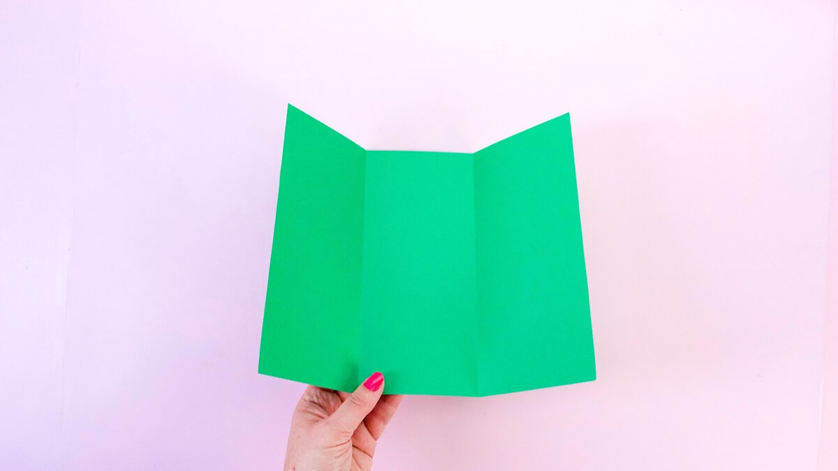 - Zelený tvrdý papier (veľkosť A4) poskladáme po šírke na tretinky tak, ako vidíte na prvej fotke. Využijeme však iba prvé 2 časti, poslednú nebudeme potrebovať.