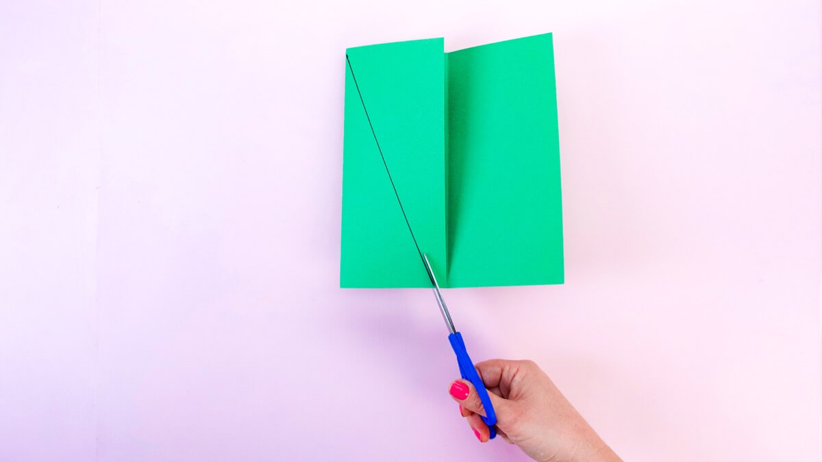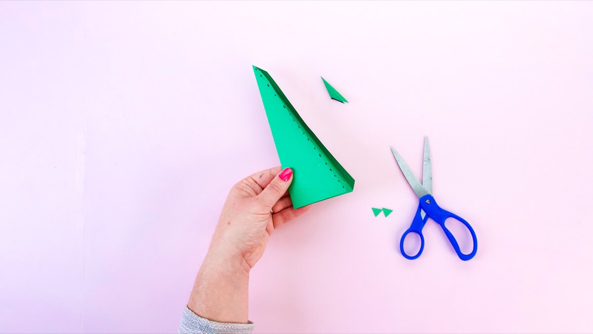 - Podľa fotky č. 3 odstrihneme vrch stromčeka a zahneme okraje (približne 0,5 cm) aby nám vznikli časti na nanášanie lepidla. Následne odstrihneme drobný trojuholník v spodnej časti obidvoch zahnutých strán.