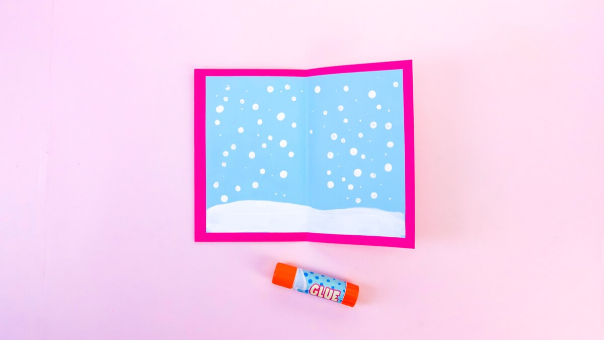 - Ďalej si pripravíme podklad – na bledomodrý papier nakreslíme alebo nalepíme snehové vločky a kopce snehu.