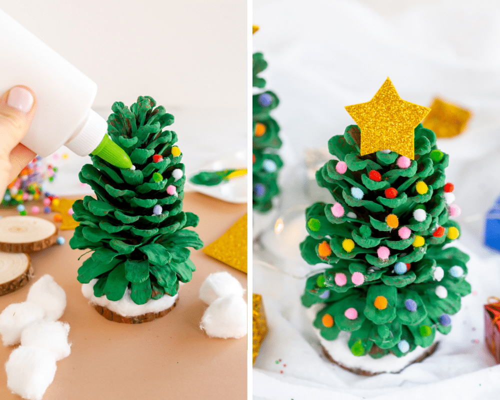 - Pomocou lepiacej pištole prilepíme šišku a ozdobíme ju pom pom guličkami.