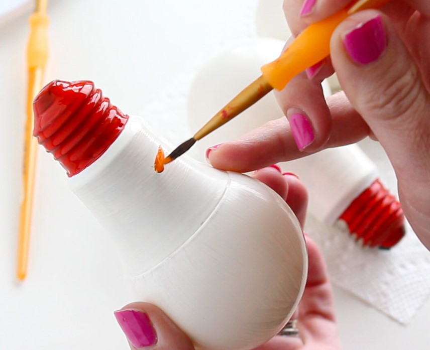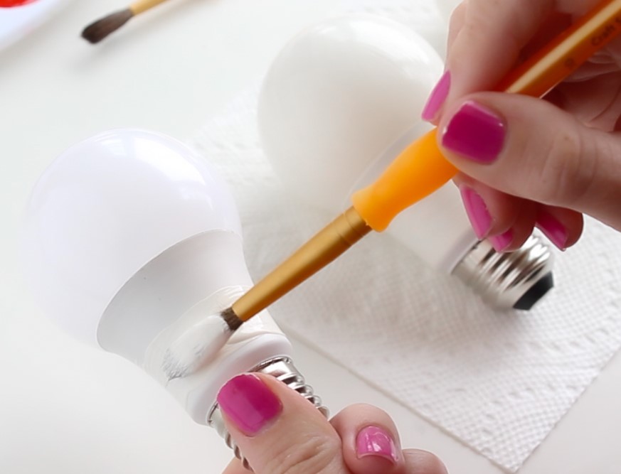 - Žiarovku natrieme bielou farbou (okrem kovovej časti) a necháme ju vyschnúť zapichnutú v krabici.