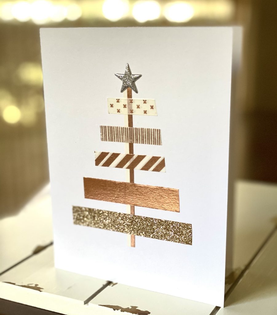 - Prvým spôsobom je použitie farebných / ozdobných lepiacich pások. Týmto spôsobom sa ľahko tvoria obrázky rovných tvarov – napríklad vianočný stromček. Z lepiacich pások jednoducho vystrihneme dlhý tenký obdĺžnik, na ktorý prilepíme rôzne dlhé kúsky – od najkratšieho po najdlhší. A samozrejme nezabudnite na hviezdičku 🙂