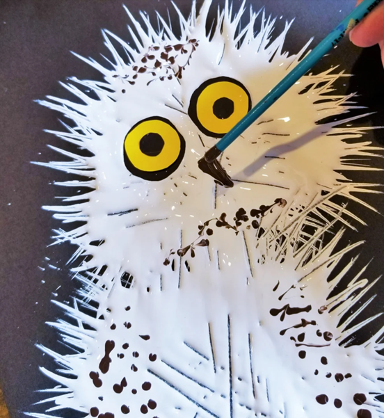 - Pomocou hrubého štetca nakreslíme 2 kruhy – telo a hlavu sovy. Nanášame väčšie množstvo farby tak, aby sa dala farba rozotierať.