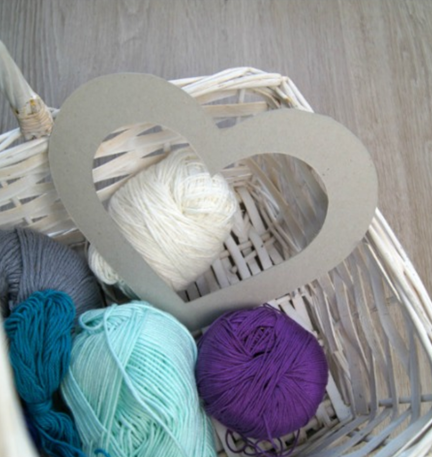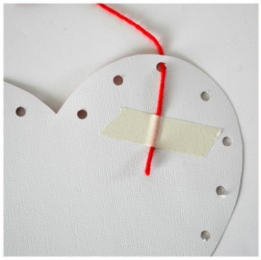 - Pripravíme si farebnú bavlnku. Jej začiatok prilepíme lepiacou páskou na srdiečko aby sa nám s bavlnkou lepšie pracovalo a neodmotávala sa.