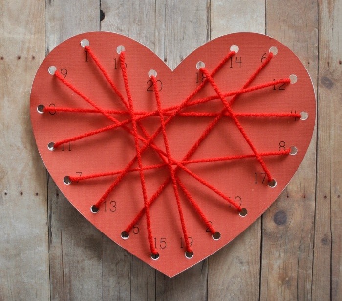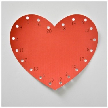 - Z tvrdého papiera si vystrihneme srdiečko, do ktorého pomocou kancelárskeho dierkovača vyrežeme 20 dierok.